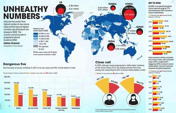 15th January 2025 In India, breast cancer was followed by lip and oral cavity cancers, cervix and uterine cancers, lung, and esophageal cancers in 2022: WHO